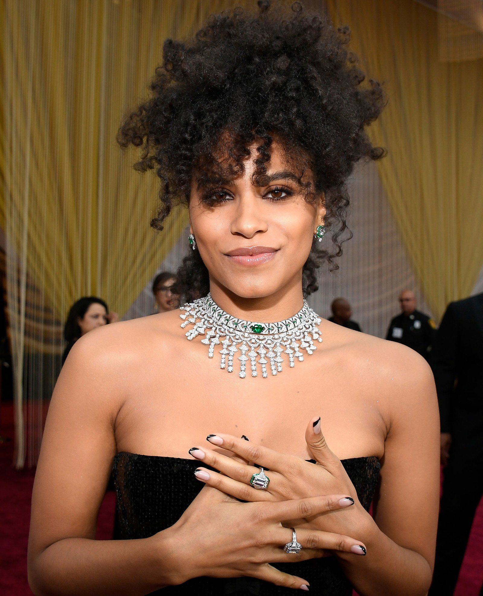 وتألقت الممثلة البريطانية، سينثيا إيريفو بمجموعة من الخواتم وزوج من الأقراط من مجوهرات Roberto Coin.