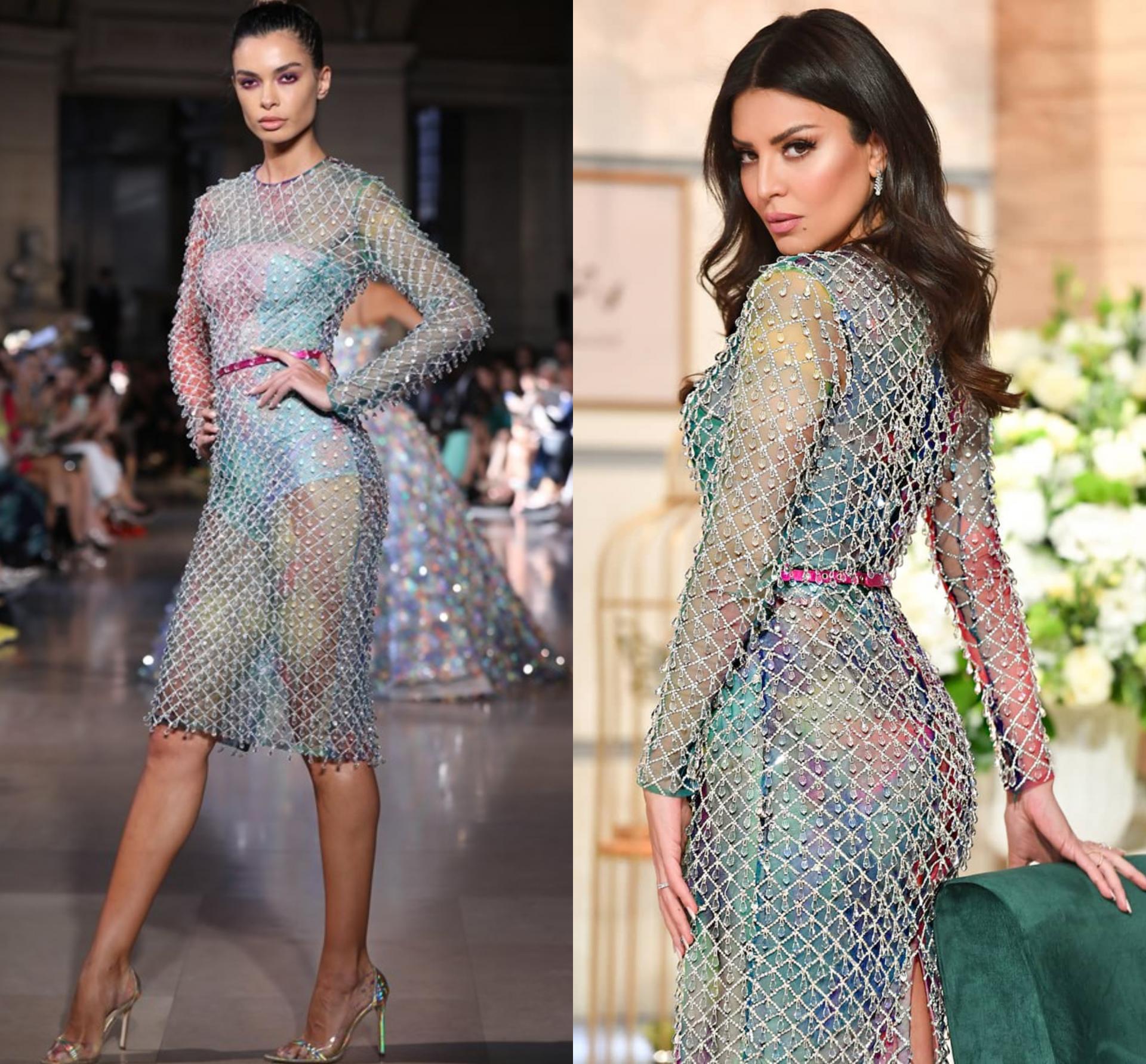 اختارت أمل فستان فضي مزين بـ سلسلة وبلورات سواروفسكي مع حزام رفيع باللون الفوشي من مجموعة رامي لـ خريف/ شتاء 2020، واختارت حذاء يجمع بين اللون الفضي والذهبي ومجوهرات ناعمة بنفس اللون أيضا.