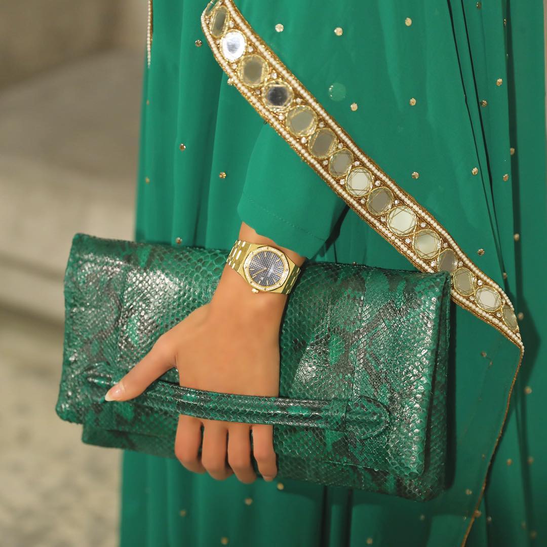 اخطفي الأضواء بالفساتين الطويلة بتصميم قريب للساري الهندي للإطلالات الليلية، إذ كسرت اللون الفيروزي للفستان ونعومته بحقيبة كلاتش بدرجة الأخضر الغامق بطبعة جلد الأفعى، أما الحجاب فاللون الأبيض يعتبر الأنسب لإبرازالمكياج بدلاُ من الحجاب الملون.