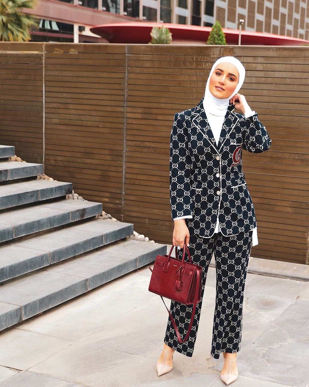 إطلالة عملية خاطفة للأنظار ببدلة منقشة نسقت معها بلوزة طويلة من الخلف لتكمل الإطلالة، وعمدت إلى إضافة حقيبة يد بلون أحمر غامق تماشياً مع الشعار الموجود على البليزر.