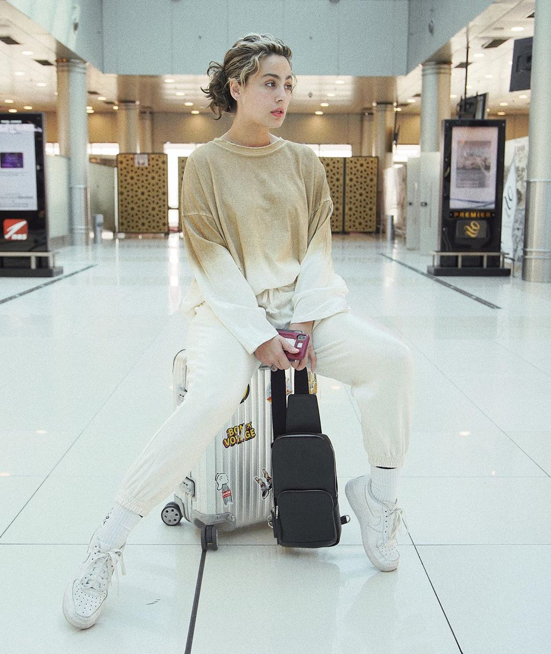 إطلالة كاجول بلمسة عصرية بسيطة، إذ اختارت كنزة وبنطلون واسعان، أما الملفت فهو ارتداء الجوارب الطويلة الذي يعتبر تريند للموسم الحالي مع حذاء رياضي مريح، وحقيبة ظهر بيد واحدة سادة "يمكنكِ إستعمال حقيبة ظهربألوان جريئة" لكسر الإطلالة.