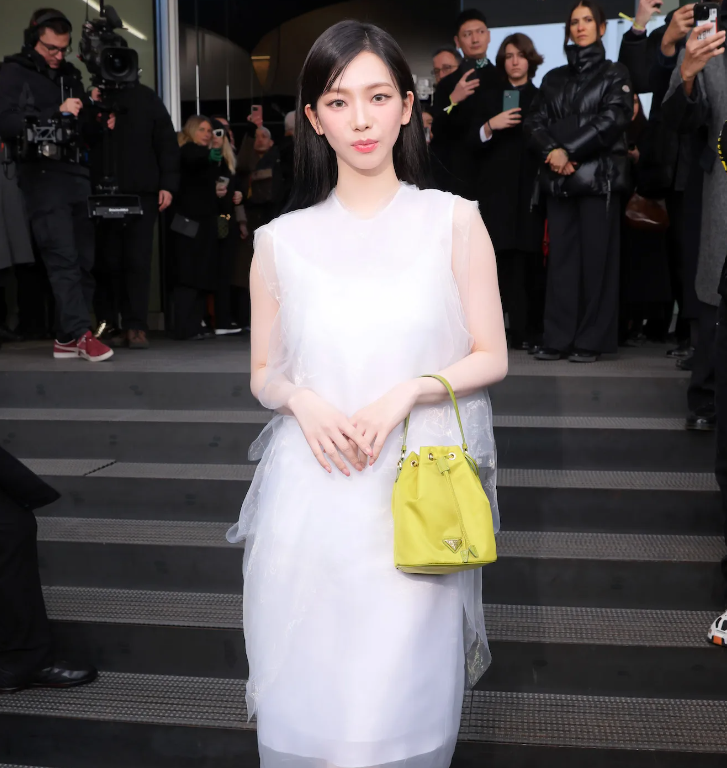 حضرت النجمة الكورية عرض أزياء برادا الرجالي لخريف 2024 في ميلانو في شهر يناير الماضي مرتديةً فستان قصير مصنوع من قماش الحرير مع طبقات من الأورجانزا من مجموعة ملابس النساء للعلامة التجارية لربيع 2024.