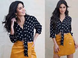 تعتبر الممثلة الهنديه كاترينا كييف واحده من اهم الممثلات وايقونات بوليوود للموضه وتشتهر دائمًا بإطلالتها العصريه فقد ظهرت بصيحه البولكا دوت وارتدت قميص اسود بنقاط البولكا البيضاء مع ربط طرفي القميص على الخصر ونسقته مع تنوره من الجلد الأصفر.