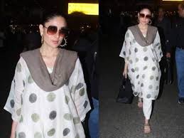 من المعروف عن الديفا الهنديه كارينا كابور بحبها لإرتداء الملابس الكاجوال المريحه وقد اعتمدت إطلاله البولكا دوت بشكل مختلف تمامًا عن الأخريات حيث ظهرت بزي الكورتا المكون من قطعتين قميص فضفاض وسروال ابيض بنقاط البولكا متعدده الالوان مثل الأخضر والبني والأزرق واكملت الإطلاله بوضع وشاح باللون البني على كتفيها.
