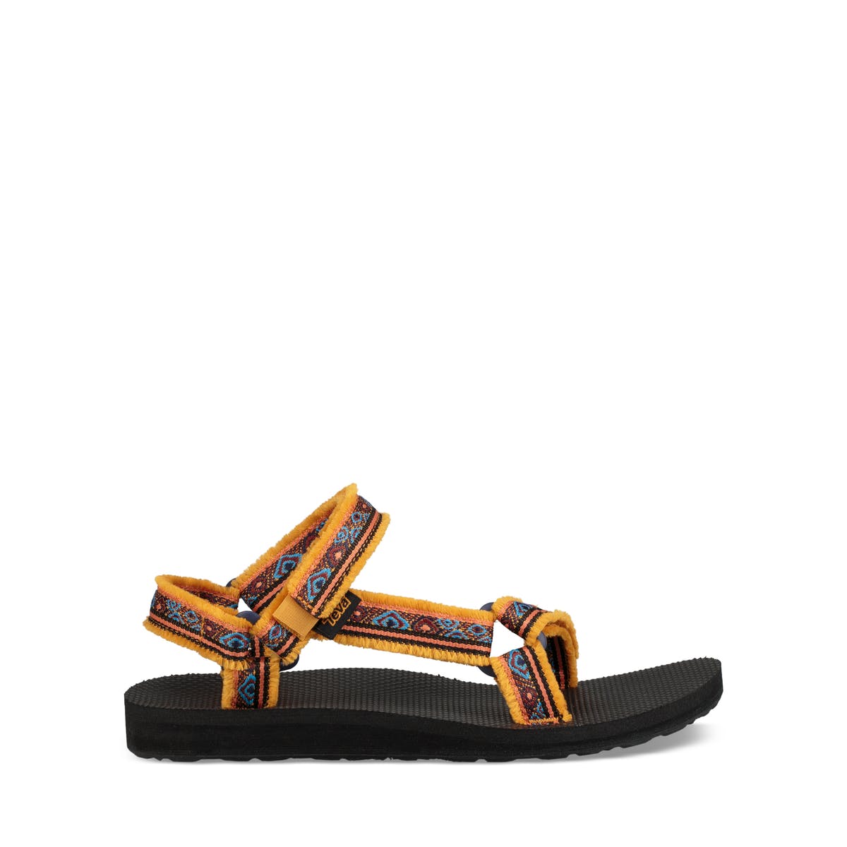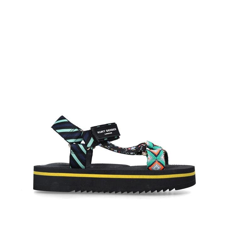 حصل صندل تيفا الأصلي على تحديث مرح مع أحزمة مطرزة ملونة؛ ويمكن ارتداء هذه الصنادل مع الفساتين القطنية السوداء.