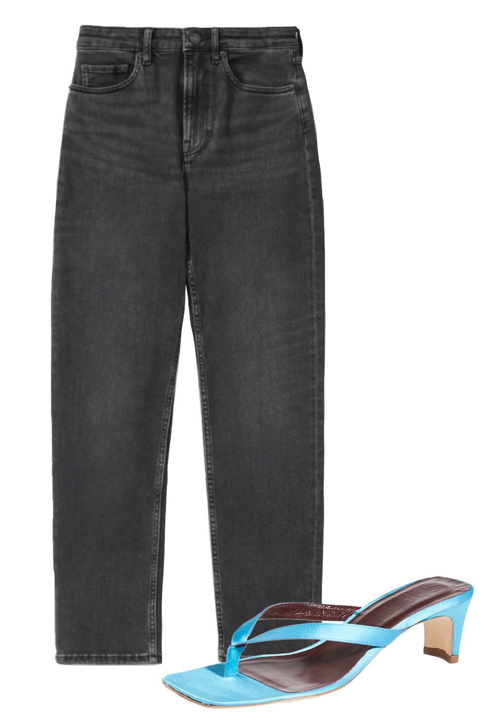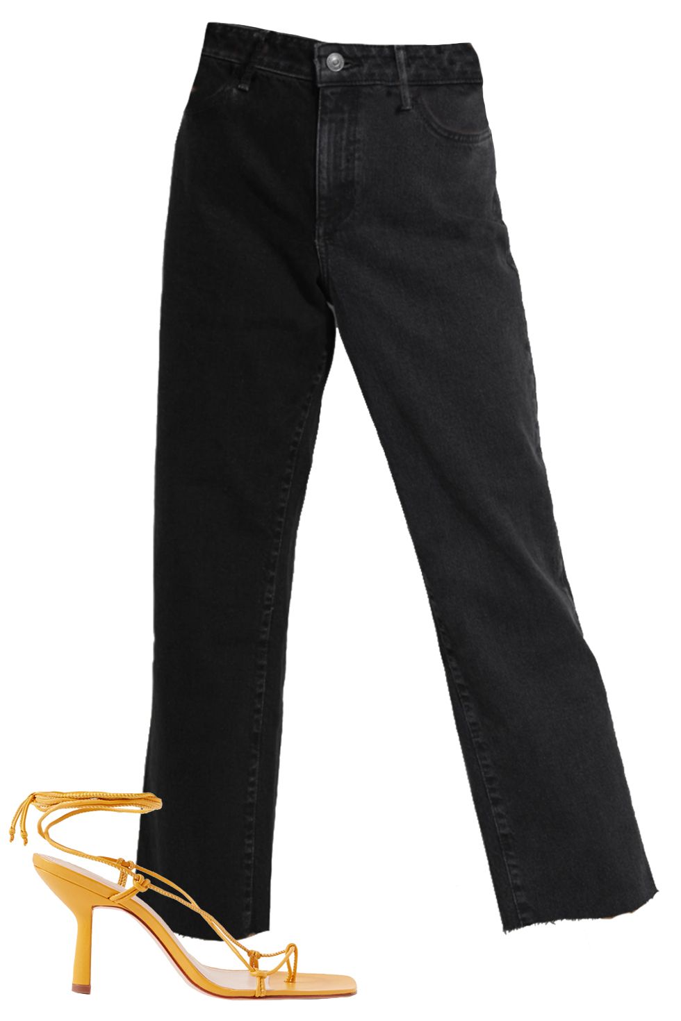 من الأحذية التي تتناسب مع جينز الدينيم الأسود هو أحذية البوب الملونة المفتوحة من الجهة الامامية وبكعب عريض منخفض.