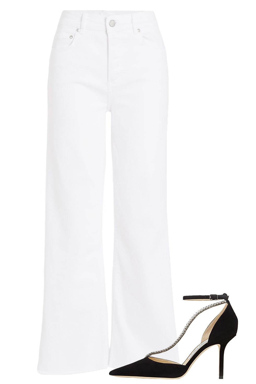 ما يبرز جمال بناطيل الجينز البيضاء هو الصنادل السوداء ذات الكعب العالِ والمرصعة بالأكسسوارات اللامعة.