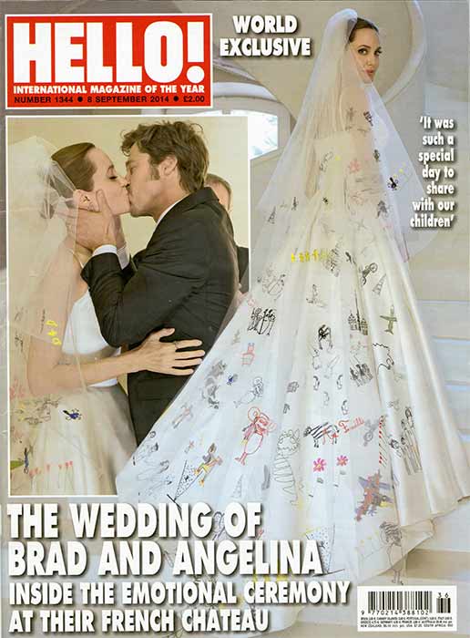 بالإضافة لما ذُكر أعلاه، لا ننسى فستان أنجلينا من "فيرساتشي"، والذي حمل بصمات أطفالها وبراد بيت، حيث تركتهم يطلقوا العنان لأنفسهم بالرسم على الفستان والطرحة.