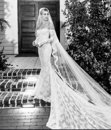 خطفت هايلي الأنظار بفستان زفاف غاية في الجاذبية من تصميم "فيرجيل أبلوه"، وبالإضافة إلى تميز الفستان بالدانتيل وتصميمه الانسيابي، تميز الفستان بأشكال أسهم مطرزة يدويًا، وهي لمسة اختارتها هايلي في إشارة لحبها لعلامة "فريجيل"، والتي تشتهر بأشكال هذه الأسهم.