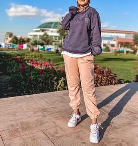 اختارت هنا العارضة بدلة كاملة باللون الأسود دع خط جانبي باللون البينك ونسقتت معه حذاء رياضي باللون الأبيض وحجاب باللون الأبيض وبدت في غاية الأناقة.