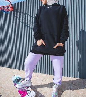 هنا ظهرت العارضة بتوب باللون الأسود الكلاسيكى وبنطال باللون اللافندر الرائج هذا الموسم وبشكل كبير، ونسقت معه هنا حذاء رياضي لامع واعتدت حجاب باللون الأبيض.