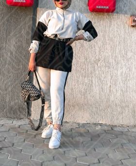 اختارت هنا العارضة بدلة ثنائية اللون يأتى التوب باللون الرمادى الداكن والبنطال باللون السيمون الفاتح، ونسقتها هنا العارضة بشكل بسيط مع حذاء رياضي باللون الأبيض ويمكنك اعتماد حجاب باللون الكافية.