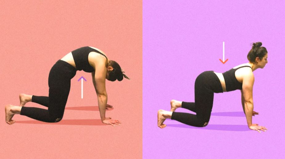 خلال هذا التمرين تقومين بالارتكاز على الركبتين واليدين بنفس وضعية القطة ومن ثم الضغط لأعلى وأسفل كما هو موضح بالصورة وذلك يساعد على زيادة المرونة في العمود الفقري والذي هو جزء كبير من آلام الرقبة في حال لم يكن في وضعه الطبيعي.