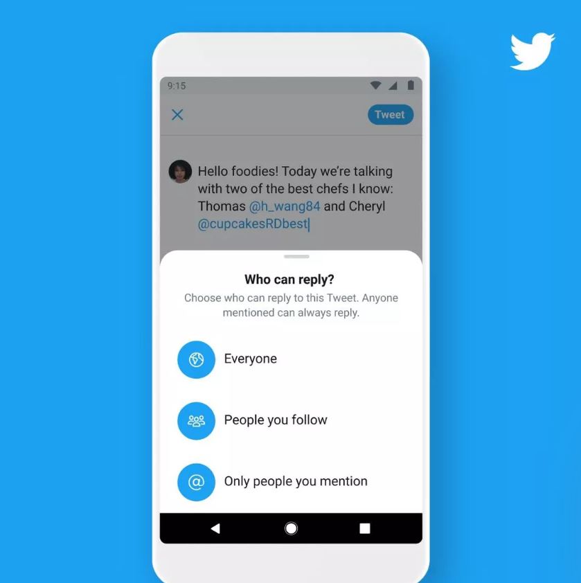 وقبل قيام المستخدم بنشر تغريدة على الموقع، سيتمكن من اختيار من يمكنه الرد والتفاعل معه من خلال ثلاثة خيارات متاحة وهي: الجميع على تويتر (والذي سيكون الإعداد الافتراضي)، أو الأشخاص الذين تتابعهم فقط، أو الأشخاص الذين تحددهم فقط.
