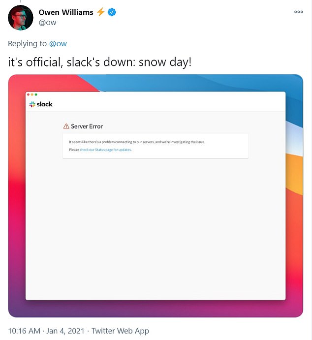 ووفقا لصحيفة "ديلي ميل" البريطانية، أصدرت شركة سلاك بيانا عن الانقطاع في الساعة 10:14 صباحًا بتوقيت شرق الولايات المتحدة على صفحتها قائلة: "قد يواجه العملاء مشكلة في تحميل القنوات أو الاتصال بسلاك في هذا الوقت".