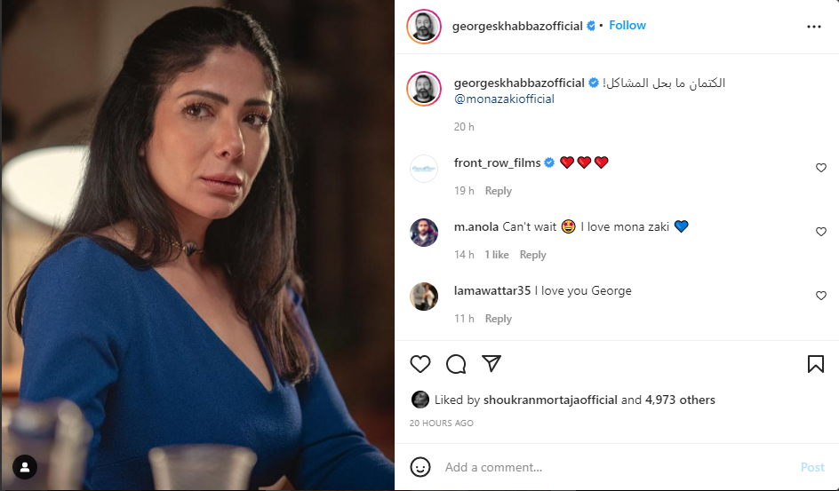ورسالة جورج خباز في طبيعة الحال ستكون موجهة للفنانة المصرية منى زكي، وجاء فيها: "الكتمان ما بحل المشاكل!".