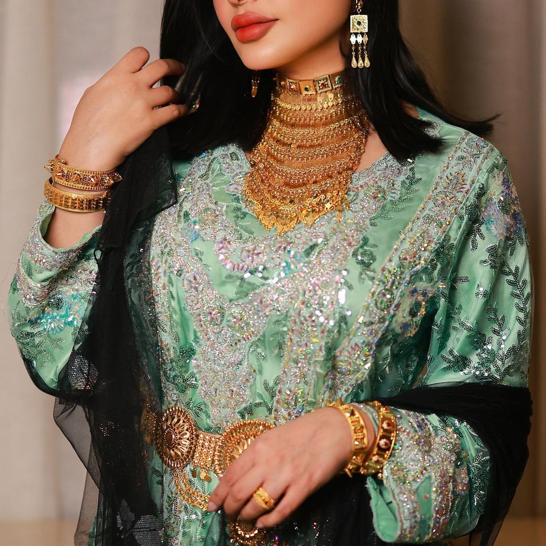 واكملت اطلالتها بارتداء قلادة ضخمة جدَا من الذهب، مع أساور ذهبية، أقراط أذن ذهبية من التراث الشعبي، كما حرصت على ارتداء حزام من الذهب ايضًا، ووضعت شال باللون الأسود في إطلالة حازت على اعجاب الجمهور بشكل كبير.