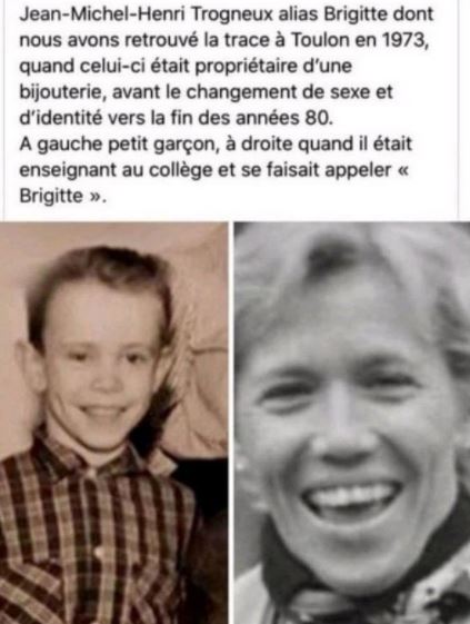 وقاات هذه الصحيفة إن بريجيت بالاصل ولدت ذكر باسم جان ميشيل تروجنو، وقالت صحيفة مجلة Faits et Documents إنها حاولت تقصي هذه الحقيقة منذ 3 سنوات، وان بريجيت ليست الام الحقيقية لابنائها لوراس وتيفاني وجوردان وسيباستيان
