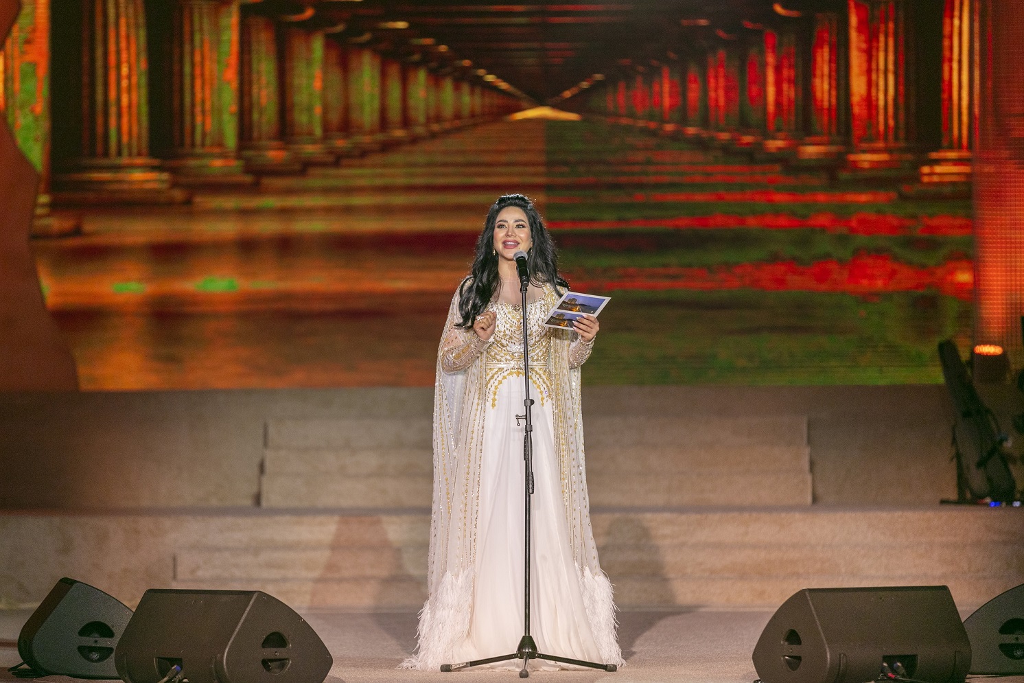 وأعربت الفنانة المصرية عن سعادتها في وقوفها لأول مرة أمام جمهورها في مدينة خورفكان قائلةً:" حظّي كبير أن أكون معكم وأحيي أول حفل غنائي يقام في هذا الصرح المعماري الجميل الذي يعكس رقي وجمال هذا البلد وشعبه الأصيل الذي تربى على الفنّ والموسيقى والقيم الإبداعية، وكلّي أمل أن يحمل العام المقبل للجميع كلّ الخير والسعادة".