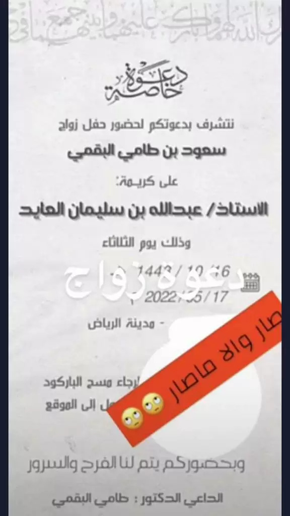 وبحسب الدعوة فإن حفل الزفاف سيقام يوم 17 مايو الحالي في العاصمة السعودية الرياض، وأثار هذا الخبر ضجة كبيرة بين رواد السوشال ميديا نظرًا لفرق السن الكبير بين السيدة أماني العايد والشاب سعود