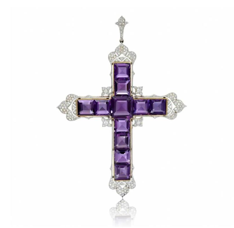 وتاتي القلادة على شكل صليب وتتميز بكونها قطعة جريئة، مرضعة بقطع من أحجار "الجمشت" المربعة، ومزينة لعدد من الالماسات الدائرية، ويبلغ وزن الألماس 5.25 قيراط.