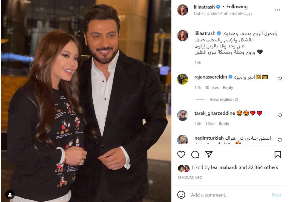 نشرت الفنانة السورية ليليا الأطرش عبر حسابها الخاص في موقع التواصل الاجتماعي صورة تجمعها بالفنان ماجد المهندس، وظهرت الاطرش مرتدية بلوزة باللون الاسود مزركشة ببعض التطريزات، نسقتها مع هوت شورت بنفس اللون