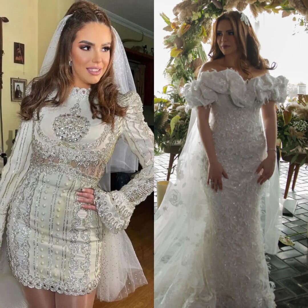 وتألقت الفنانة المصرية بفستان باللون العاجي من تصميم هاني البحيري وارتدت عليه طرحة باللون الأبيض مما شكك البعض بأنه حفل زفاف وليس عقد قران، وفي اطلالة اخرى ارتدت فستان ابيض طويل بدون أكتاف مع طرحة