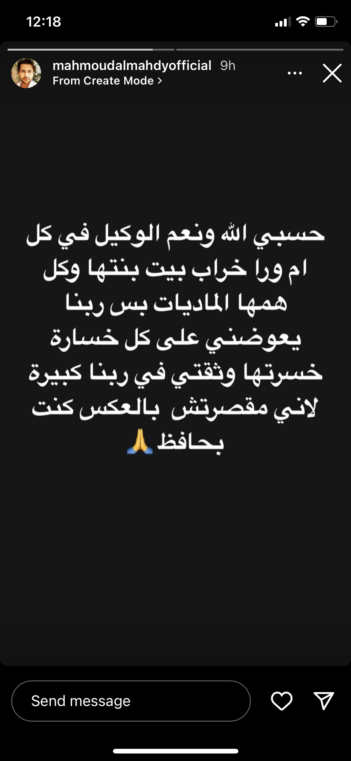 من جانبه خرج الفنان المصري عن صمته موضحًا أسباب الانفصال متهمًا والدة الفنانة المصرية في الأمر، وقال عبر ستوري حسابه في إنستغرام: "حسبي الله ونعم الوكيل في كل ام ورا خراب بيت بنتها.. وكل همها الماديات.. بس ربنا يعوضني عن كل خسارة.. وثقتي في ربنا كبيرة.. لاني مقصرتش بالعكس كنت بحافظ"