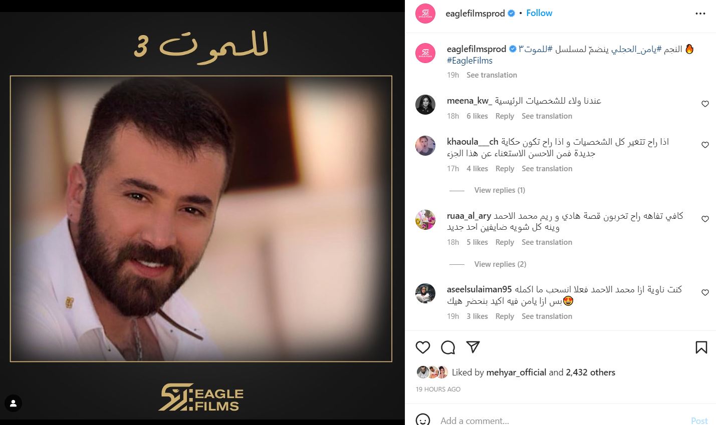كشفت الصفحة الرسمية الخاصة لشركة الإنتاج ايغلز فيلم لصاحبها جمال سنان، عبر موقع التواصل الاجتماعي انستغرام، عن انضمام الفنان السوري يامن الحجلي إلى الجزء الثالث من مسلسل للموت.