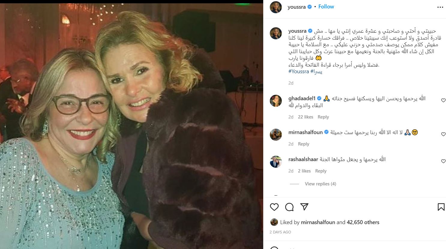 وكانت الفنانة المصرية قد نعت زميلتها الفنانة مها أبوعوف التي فارقت الحياة يوم الأربعاء الماضي عن 65 عامًا بعد صراع مع مرض السرطان ونشرت صورة تجمعهما على انستغرام وكتبت معلقة: "حبيبتي و أختي و صاحبتي و عشرة عمري إنتي يا مها .. مش قادرة أصدق ولا أستوعب إنك سيبتينا خلاص .. فراقك خسارة كبيرة لينا كلنا مفيش كلام ممكن يوصف صدمتي و حزني عليكي .. مع السلامة يا حبيبة الكل إن شاء الله متهنية بالجنة ونعيمها مع حبيبنا عزت وكل حبايبنا اللي فارقونا يارب فضلا وليس أمرا برجاء قراءة الفاتحة والدعاء.